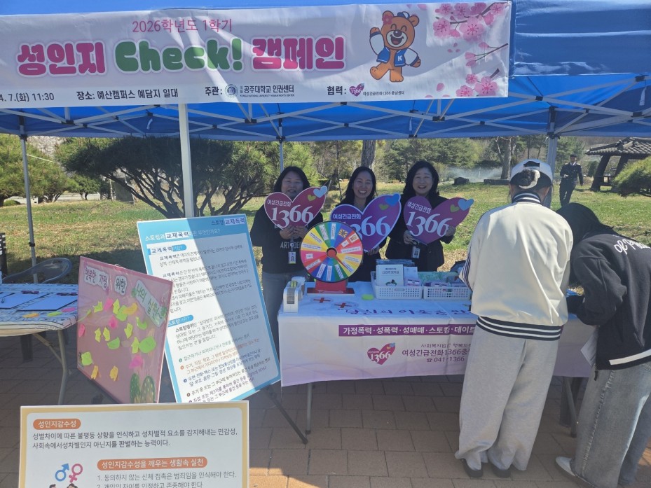 내용: 1366충남센터는 국립공주대학교 예산캠퍼스를 방문하여 잰더폭력 예방과 여성인권 증진을 위한 건강한 대학문화 조성 캠페인에 참여함